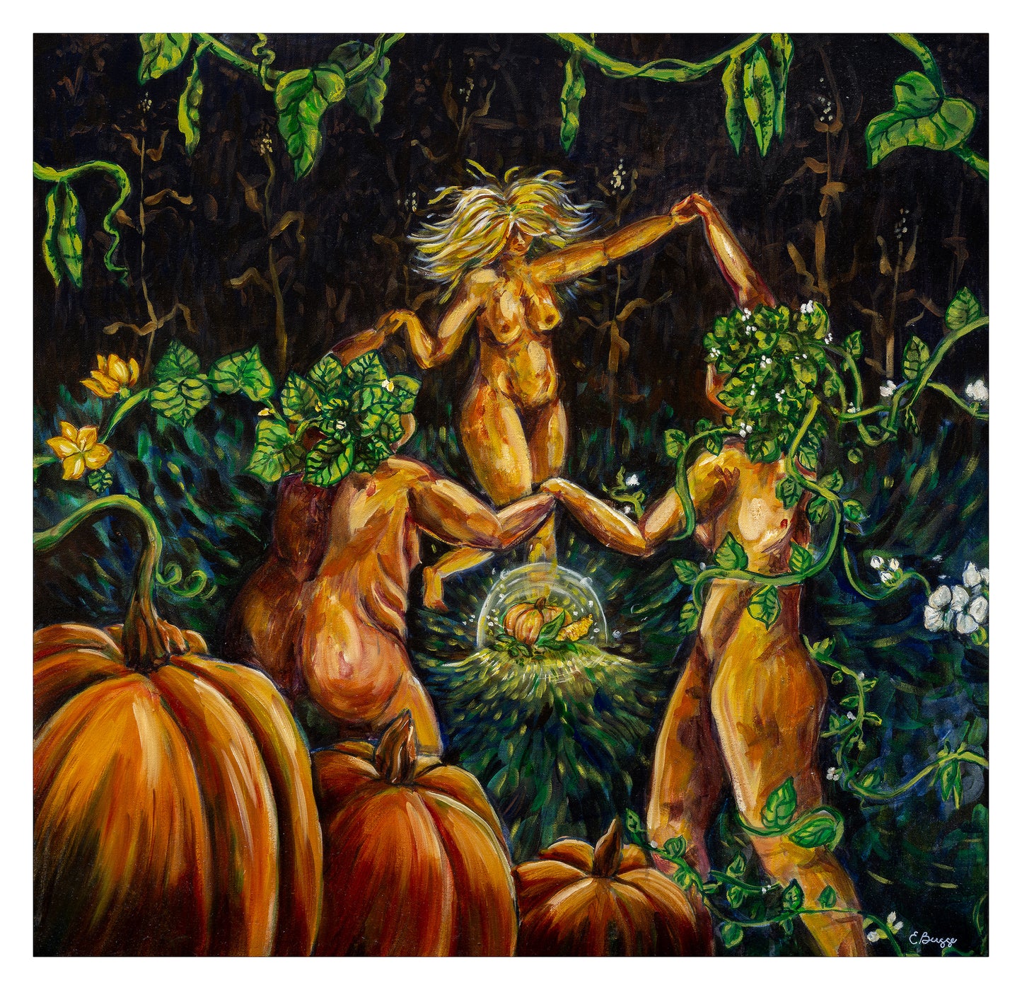 "3 Sisters" is the celebration of the Harvest come to life. These muses dance around the abundance of the garden.