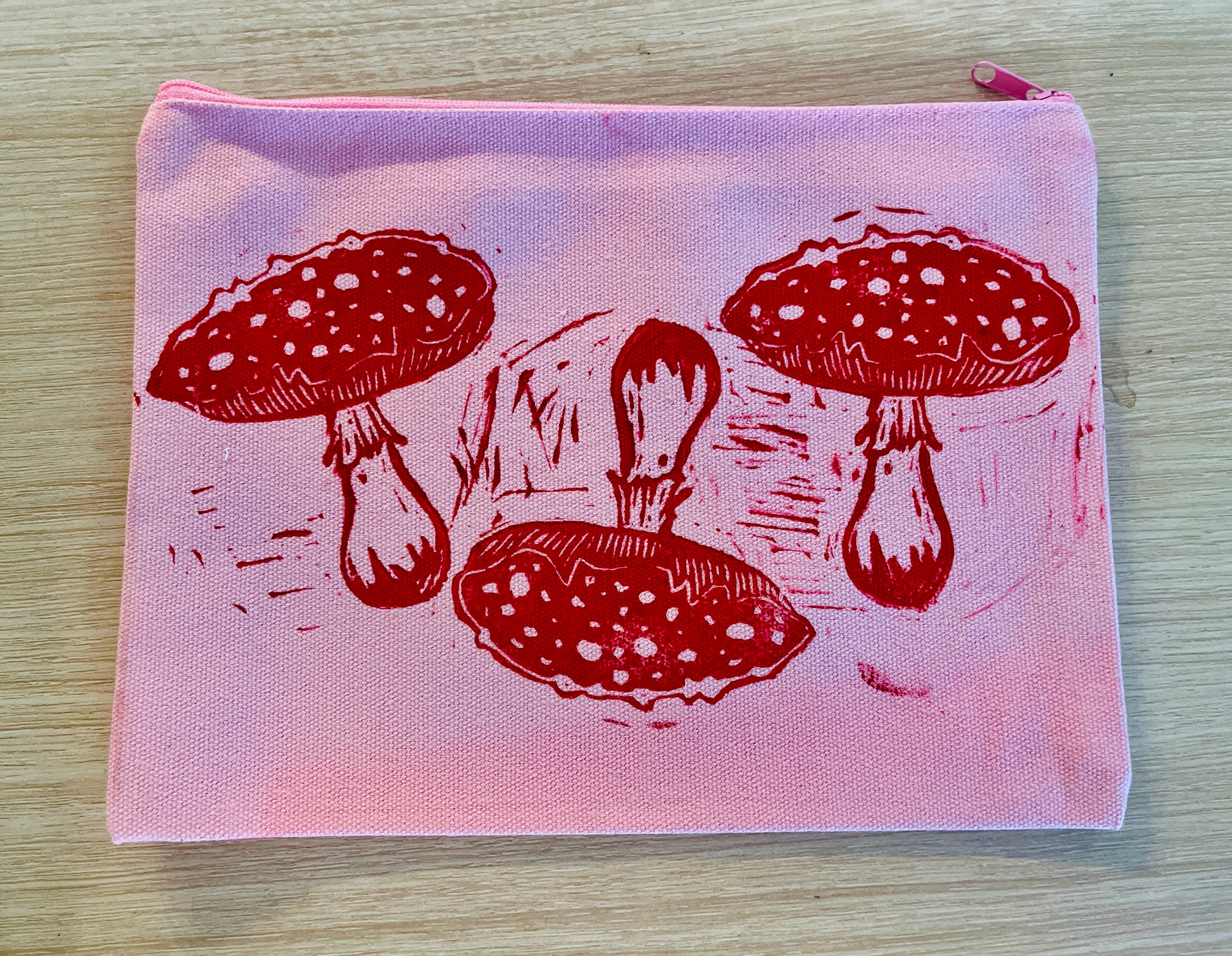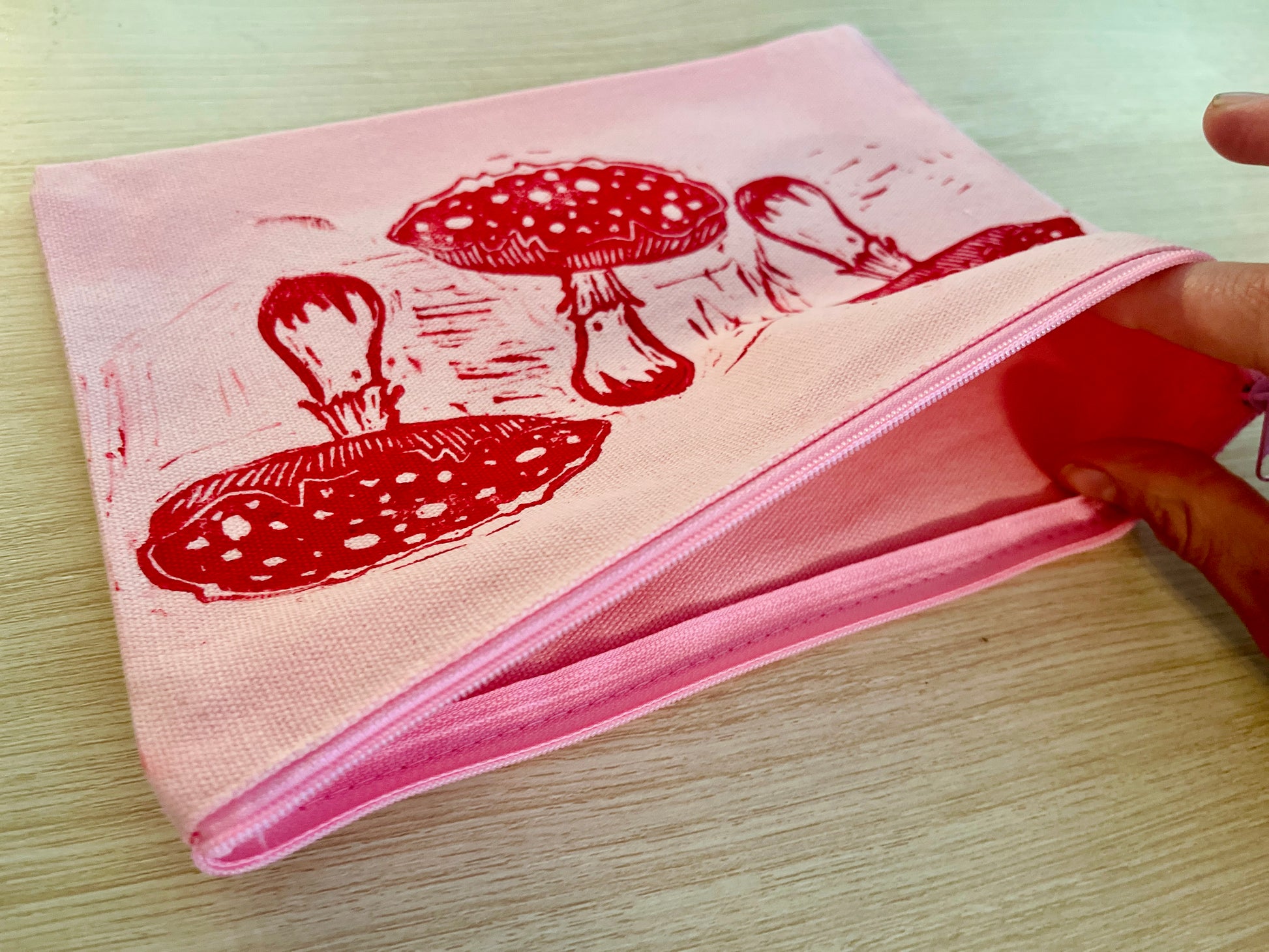 This zip pouch comes in handy and is perfect for storing your mushrooms, pens, pencils, keys, nail polishes, tooth brush, make up, or whatever else you can think of! It is a light pink color with hand stamped agaric mushrooms in red on it. The agaric mushrooms are my original linocut design and carving. Made with love!