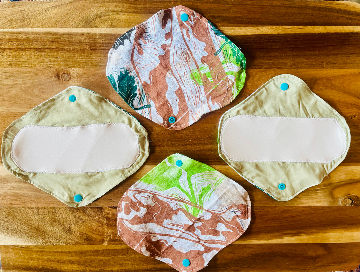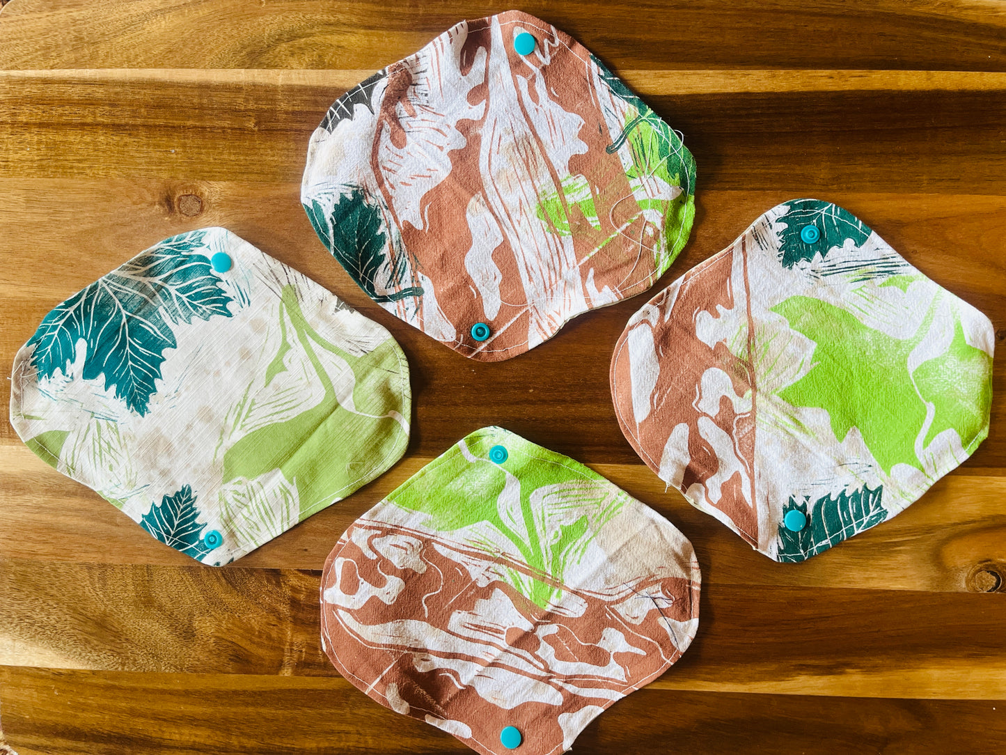 This is my regular size reusable pad, for normal to high flows. It is thin and comfortable, these reusable pads are hand sewn and feature camo pattern linocut print on the fabric.