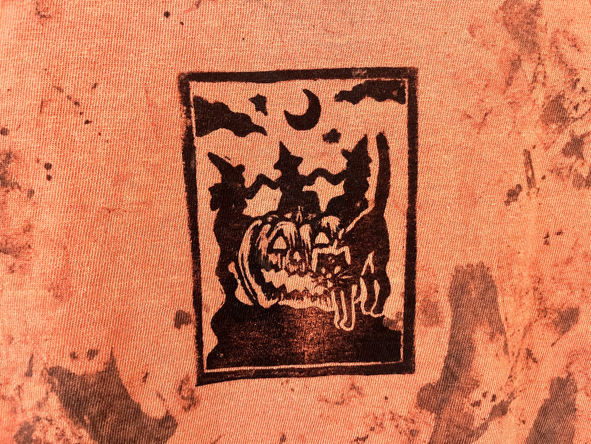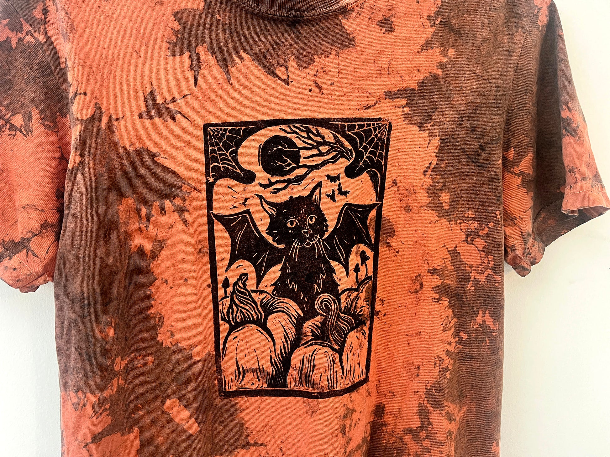 Cat Bat is one of my favorite original linocuts, a perfect hoodie to keep you warm for Fall and Spooky season. This is a one of a kind, small batch, shirt that is only available this time of year. It features 2 original linocut designs. On the front of the shirt, featuring a black cat, spider webs, and pumpkin, and a witchy block print on the back.