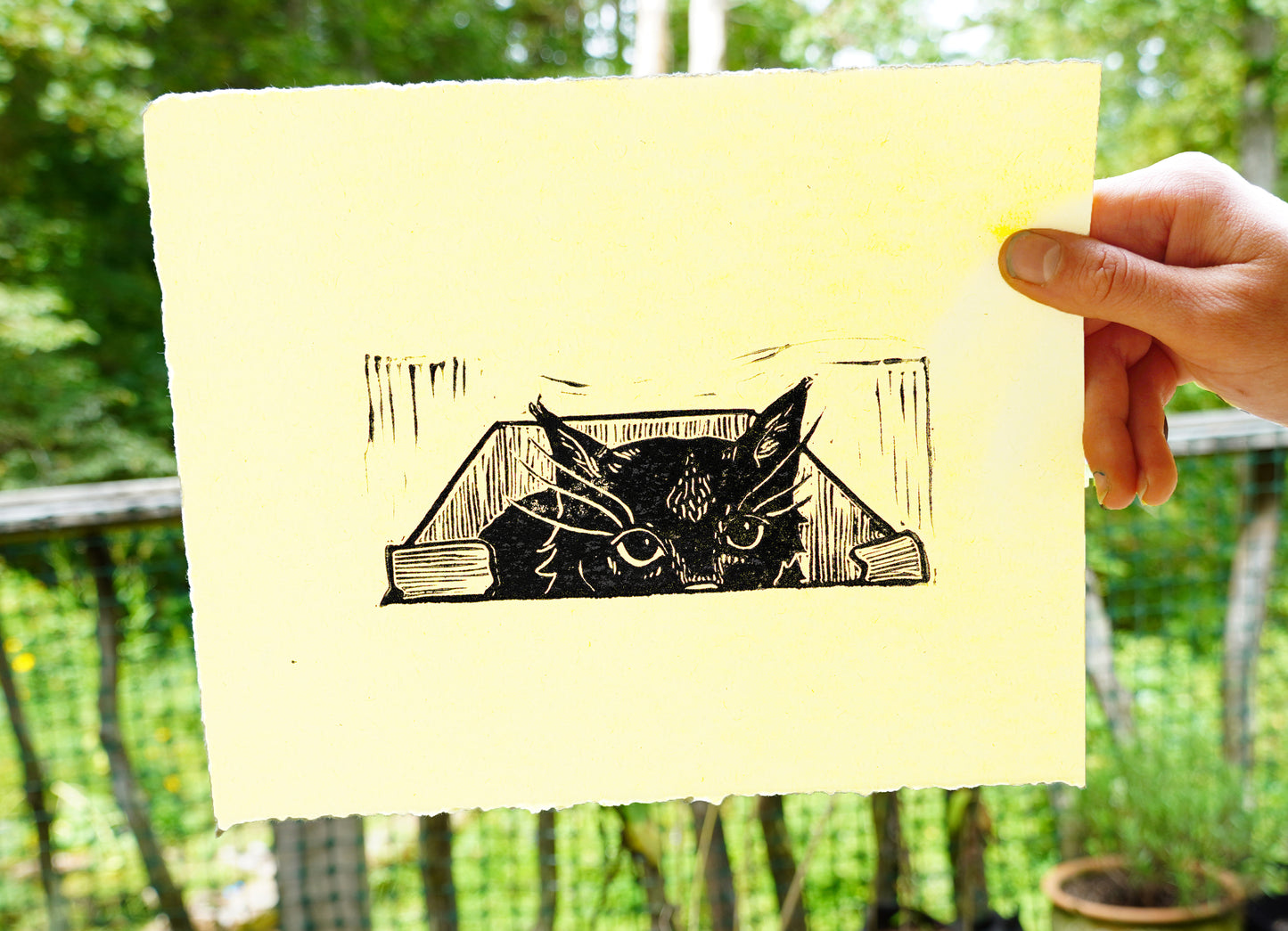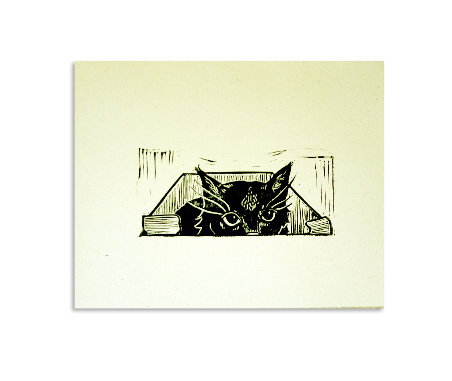 Cats love boxes, it is undeniable and way to funny for us to witness. Whenever I get a package and empty the box, my cat jumps in almost immediately. I love it! I made this piece because I think a lot of cat owners can relate to the love and humor of this personality trait. I call this one "Box Girl". It is an original hand carved and hand stamped linocut art piece.