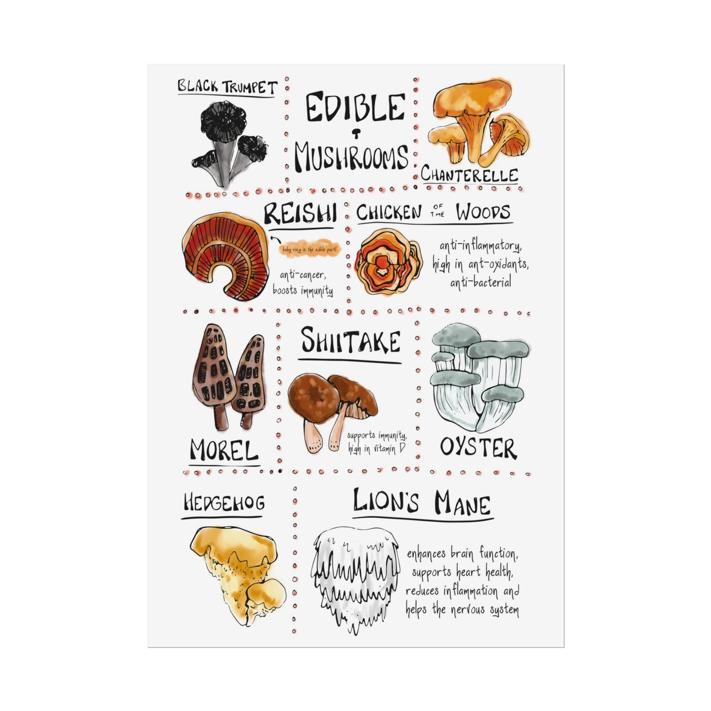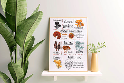 My edible mushroom chart brings knowledge and the reminder that nature is working with us into your home. Mushrooms provide nutrition and beauty to us, and are the underground decomposers of Nature. Always working behind the scenes to make sure ecosystems are functioning properly, much like how they help our internal ecosystems. Putting this chart in your kitchen will provide you with a beautiful spark of conversation and interest in mushrooms with your guests. Giving it as a gift could get someone interested in the wonderful world of mycology. Featured on this chart are only a few of many edible and medicinal mushrooms, including morels, black trumpets, hedgehogs, chicken of the woods, reishi, oyster, shiitake, and chanterelles. Western society has always had a fear undertone of mushrooms, but this chart is aimed to help change that dialog.