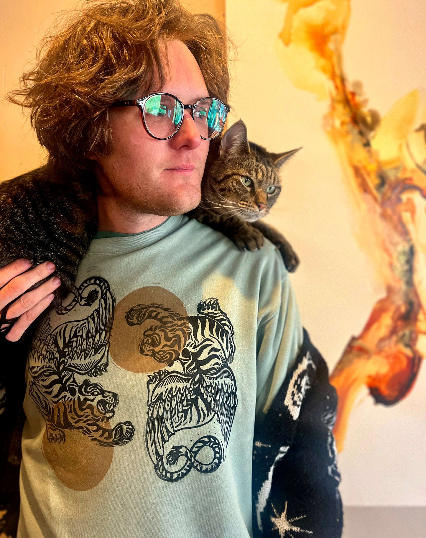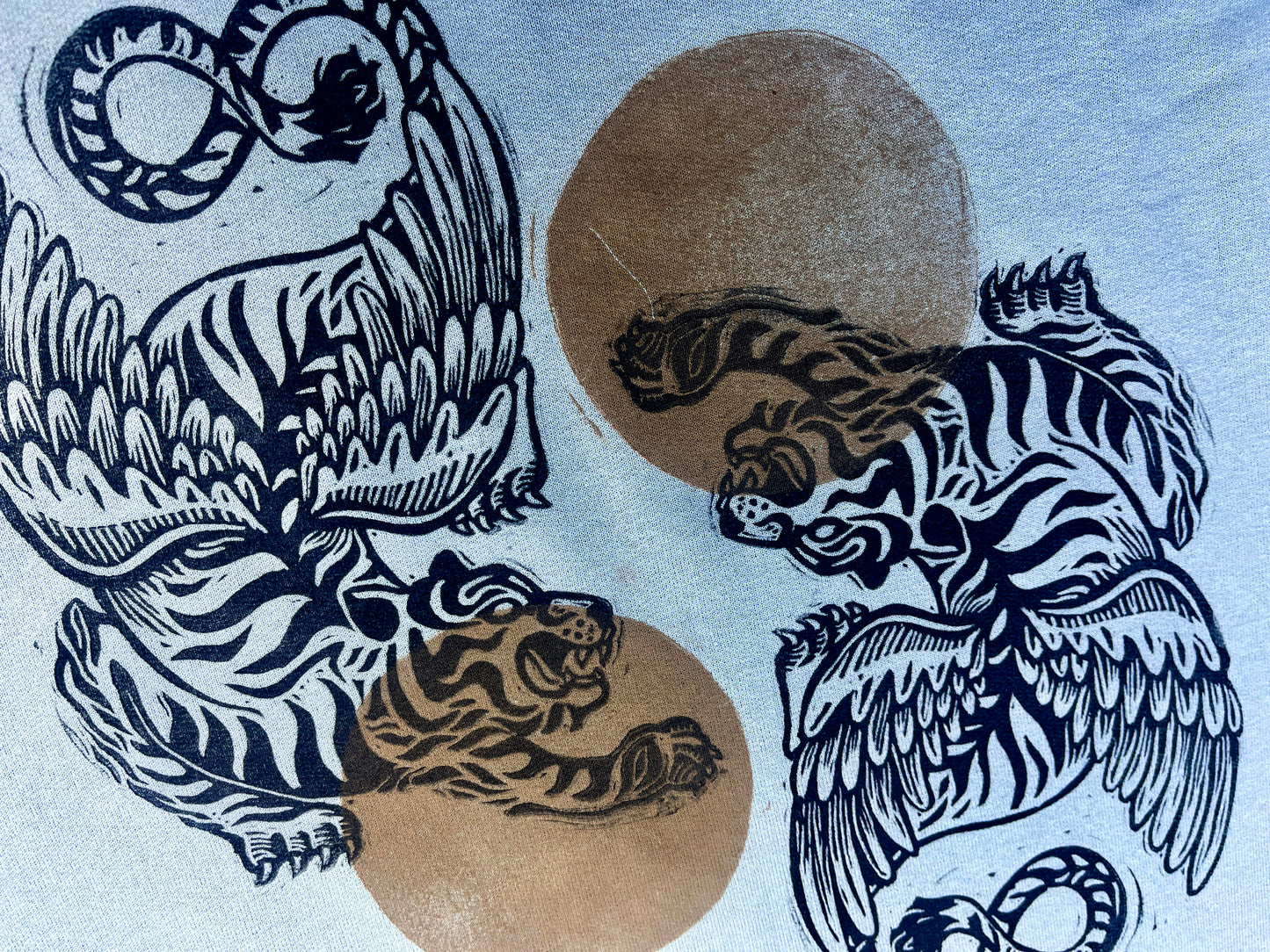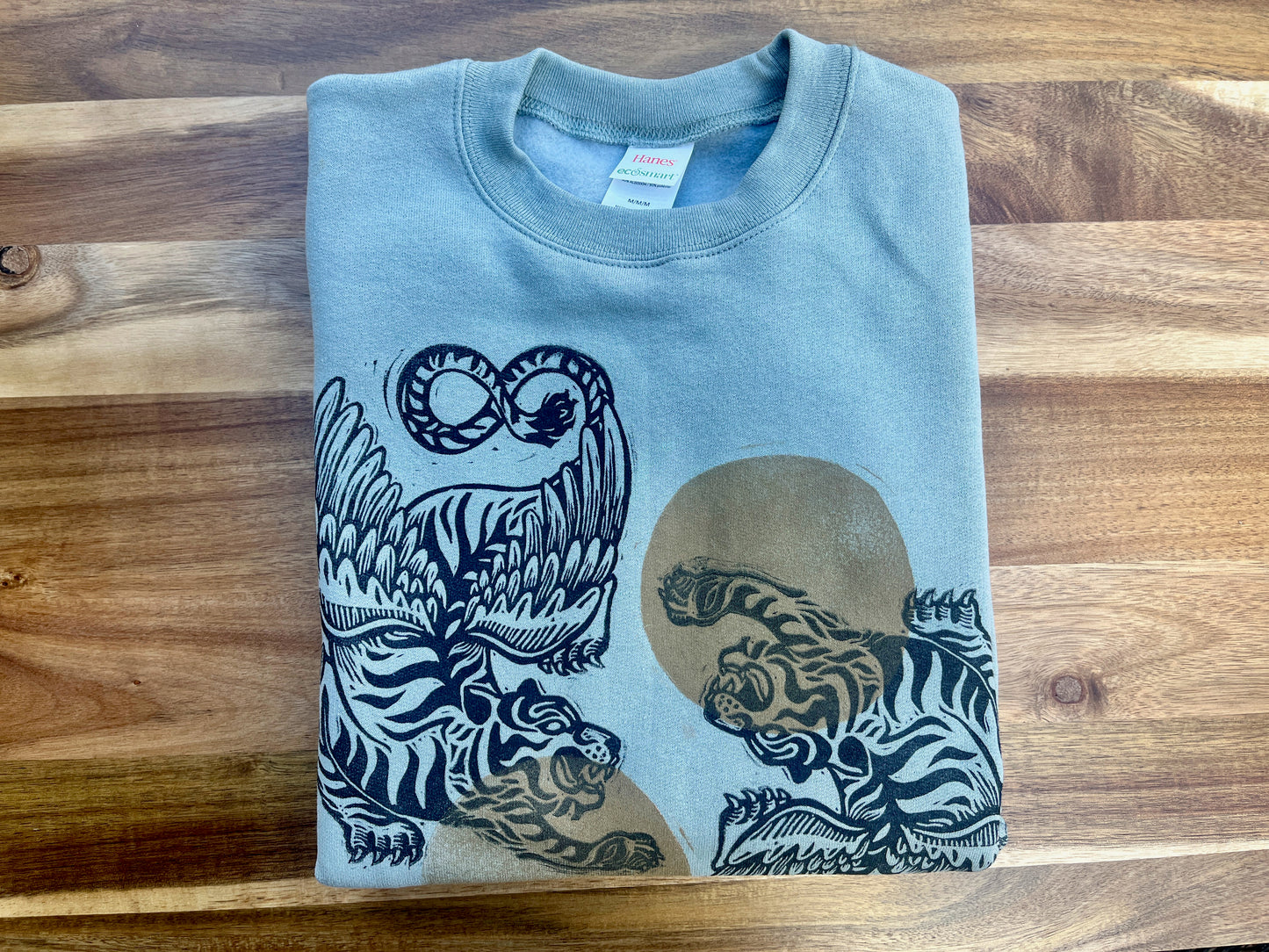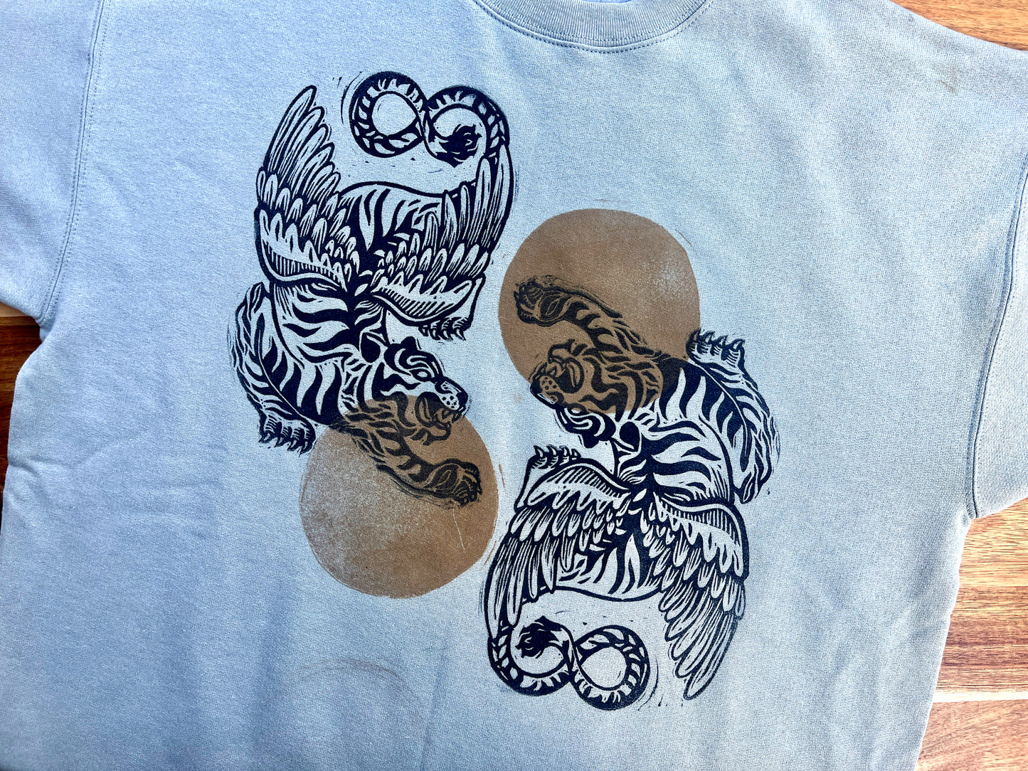 The indomitable spirit of the flying tiger printed on a super soft crew neck. This sweatshirt has 4 hand printed linocut blocks to create the final design, to burnt orange suns and two tigers.