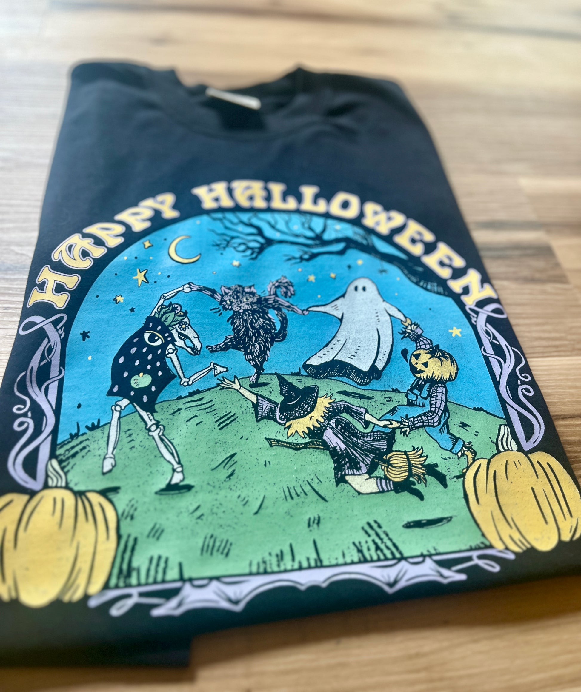 I hope you have a Happy Halloween and I drew this spooky crew to help you celebrate! It is modeled after the famous painting by Matisse called "The Dance". Reimagined and hand drawn and printed for you! Available on a comfort colors pepper or black tshirt, size chart attached.