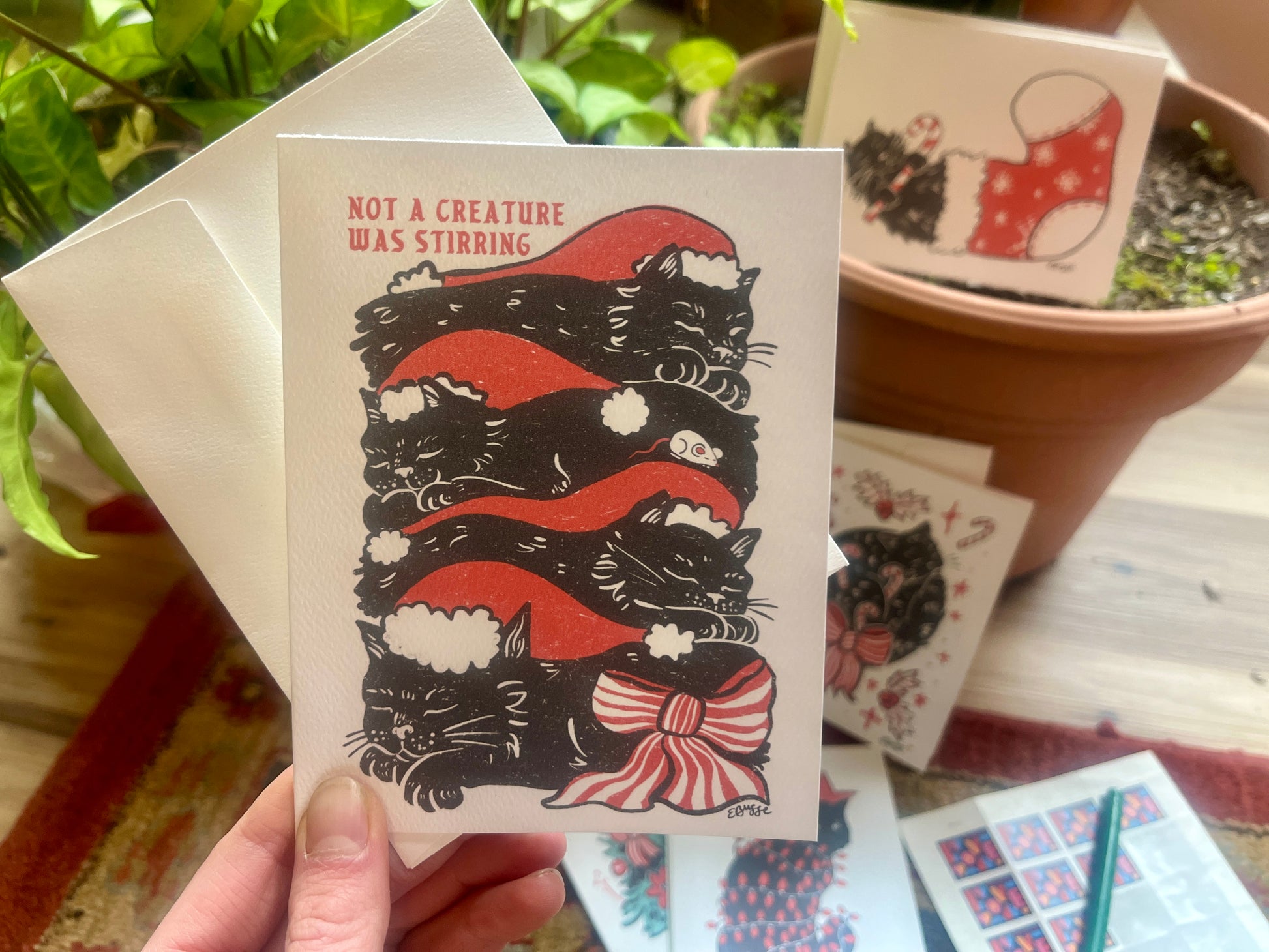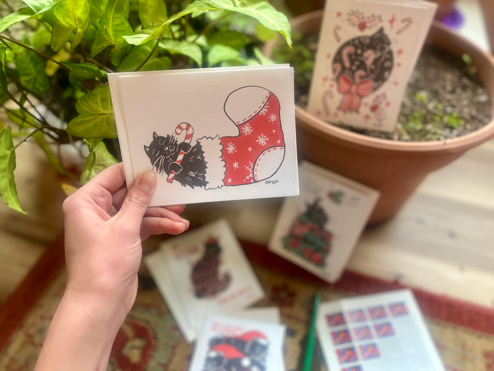 Enjoy this delightful and festive cat themed Christmas or holiday inspired cards. There are 5 cards in the set, each with an original cat illustration I drew. Printed on a blank inside, linen textured card. The cards are 4.25x5.25” folded and each comes with an envelope.