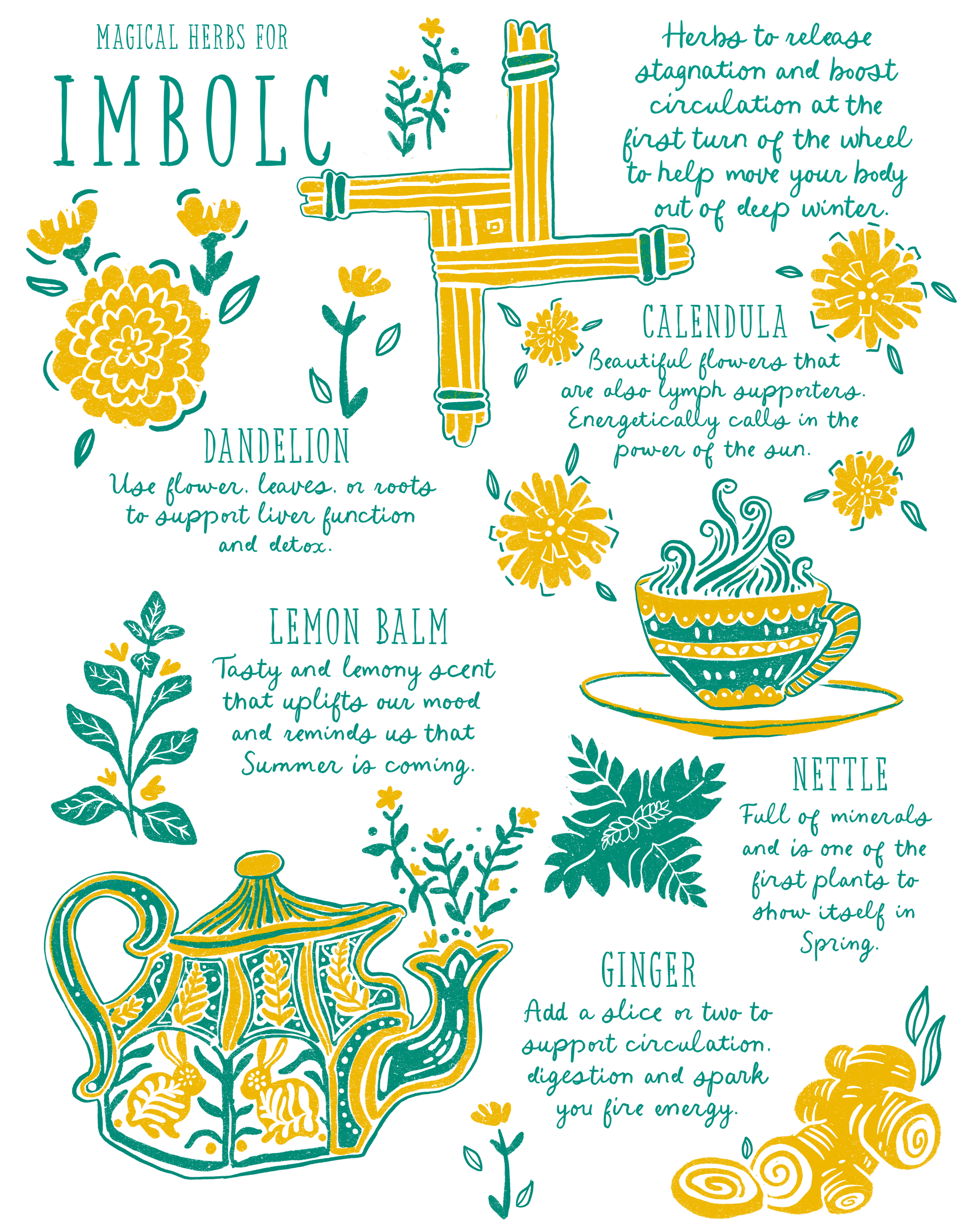 It’s time to help the earth and our bodies wake up, it’s time for Imbolc! This tea towel features my hand drawn design of magic herb friends to help us celebrate this sabbat. It features flowers like dandelion and calendula and nourishing herbs like Ginger, nettle, and lemon balm. Under each herb, I wrote a short bit about their medicinal and spiritual properties. The illustration is delightful, and I hope it brings much joy to your kitchen this time of year.