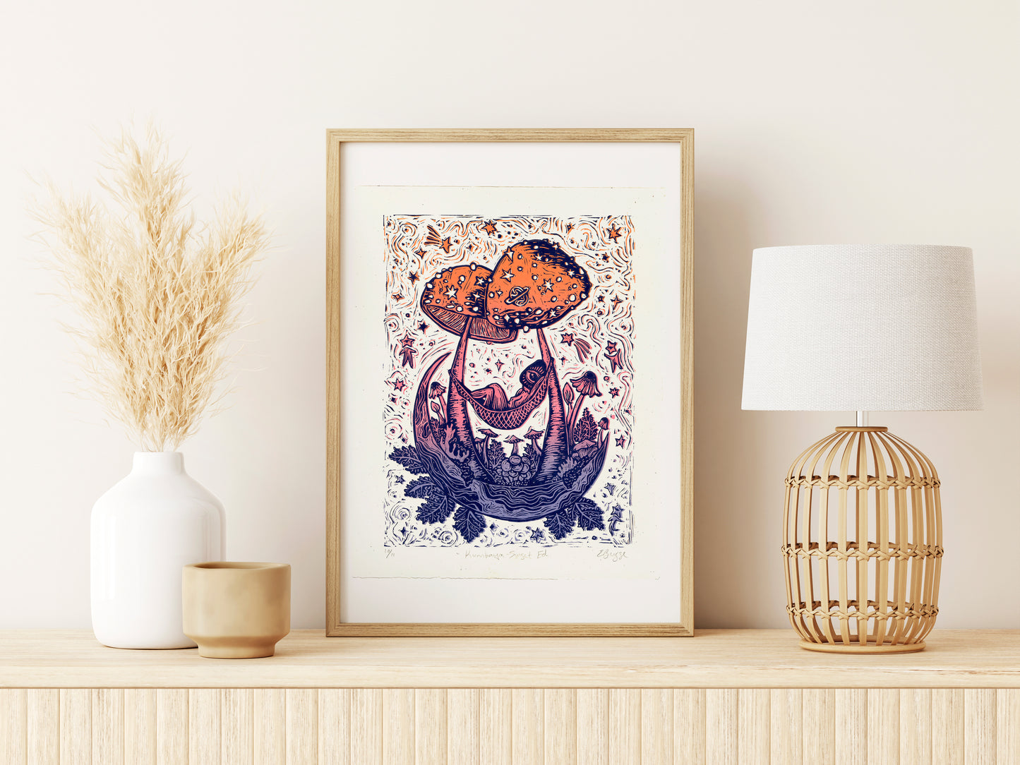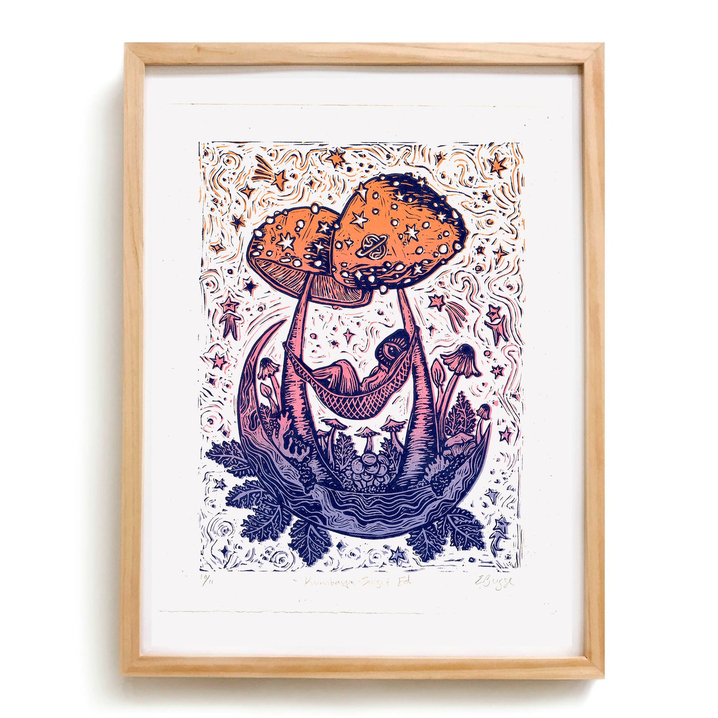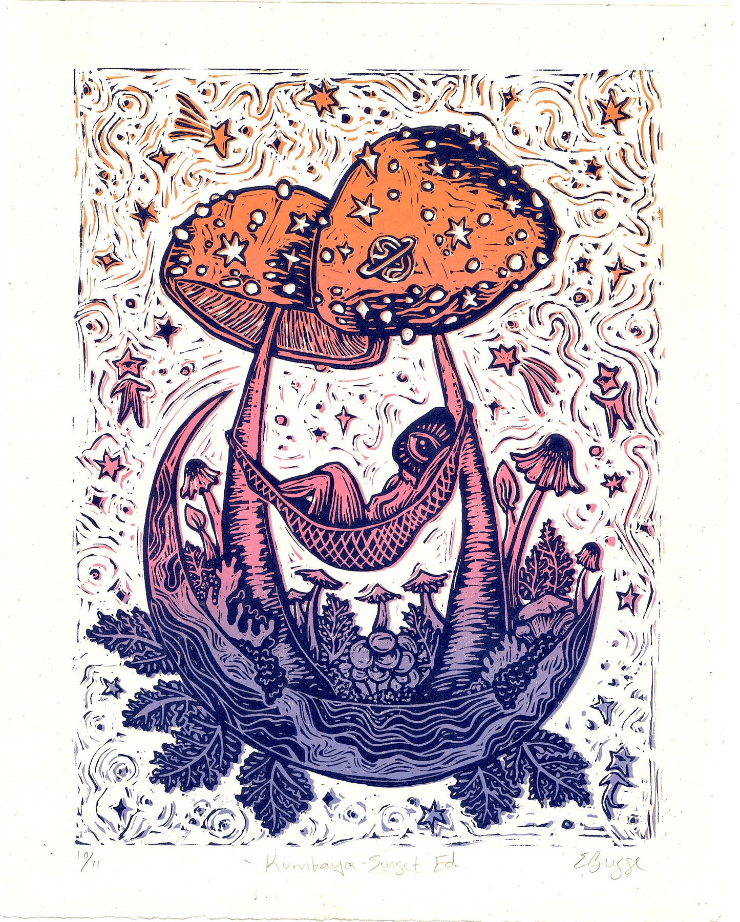 "Kumbaya Sunset" is an original 2 color linocut print. 11x14" with deckel edges, this print features a beautiful rainbow roll and line work. Limited edition of 11.