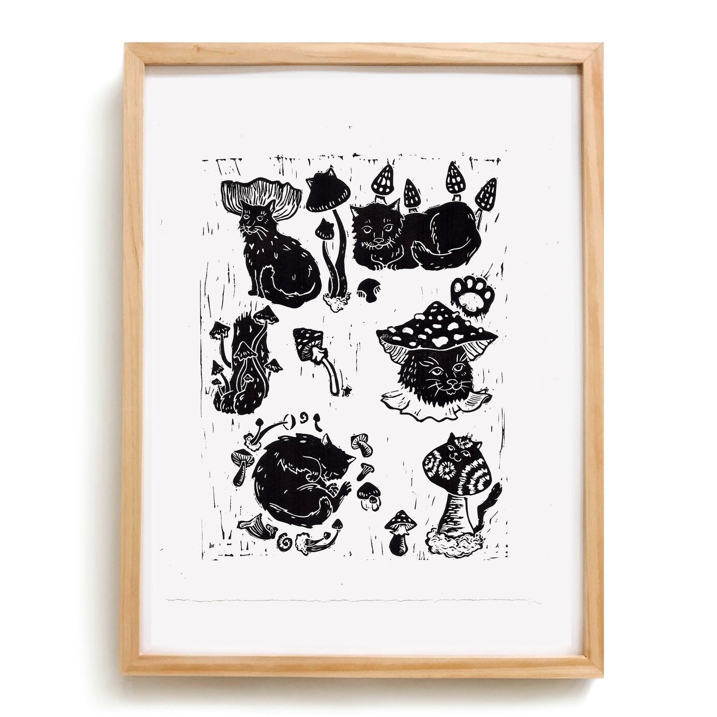 "Meowshroom" is a limited edition, 1 color linocut print. It is printed on stonehenge printmaking paper with torn, deckle, edges. 11x14, edition of 15.
