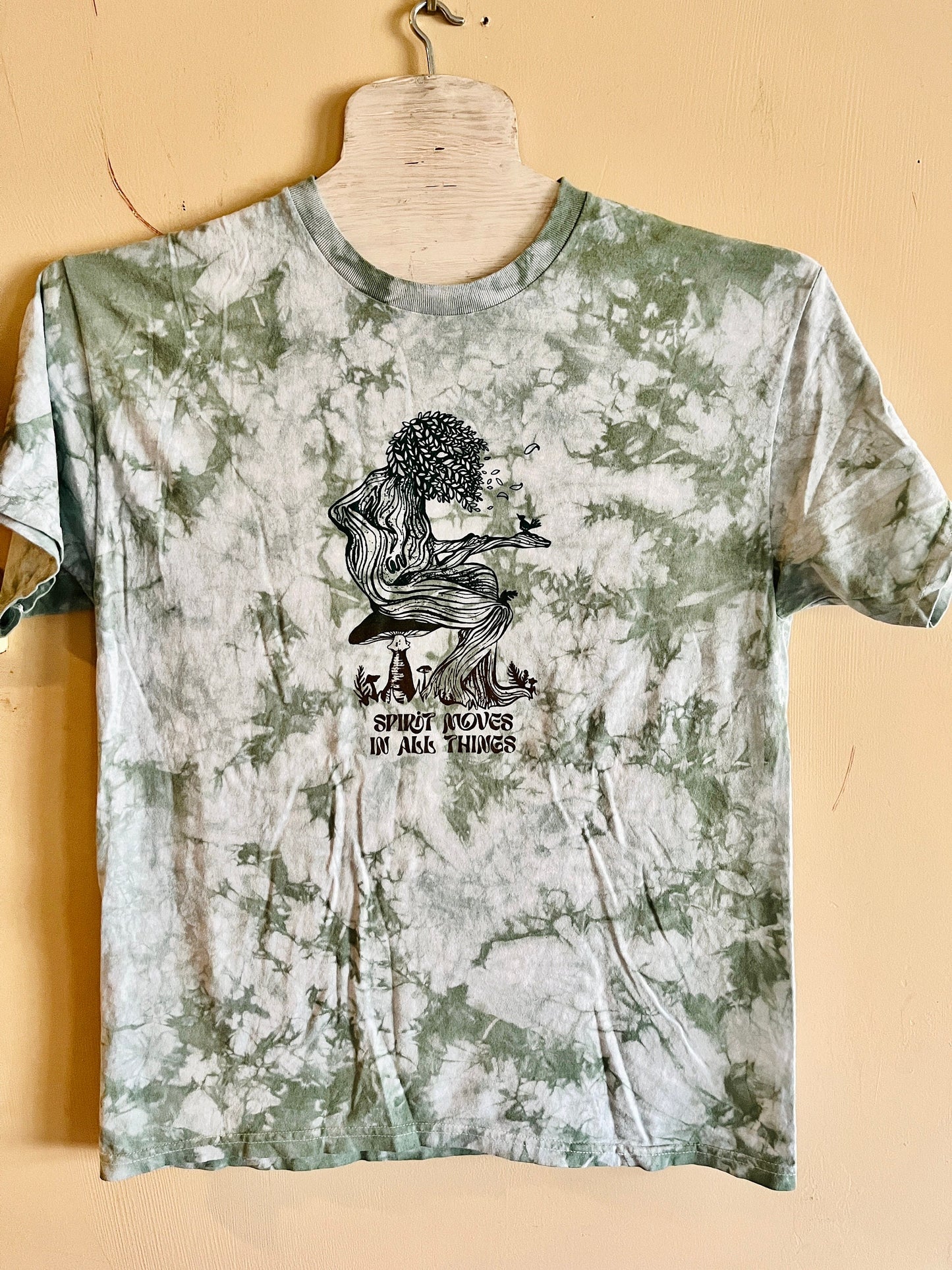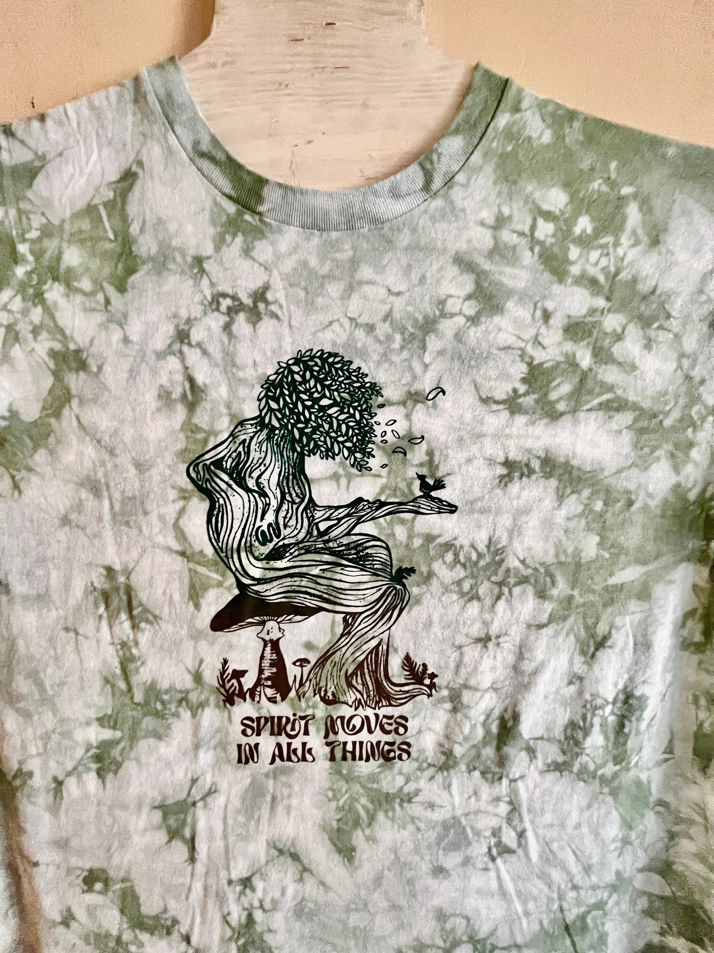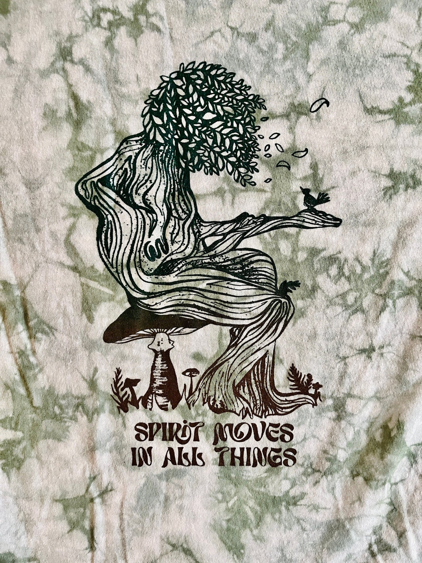 Printed in an earthy green to brown split fountain on a moss green tie dye T.