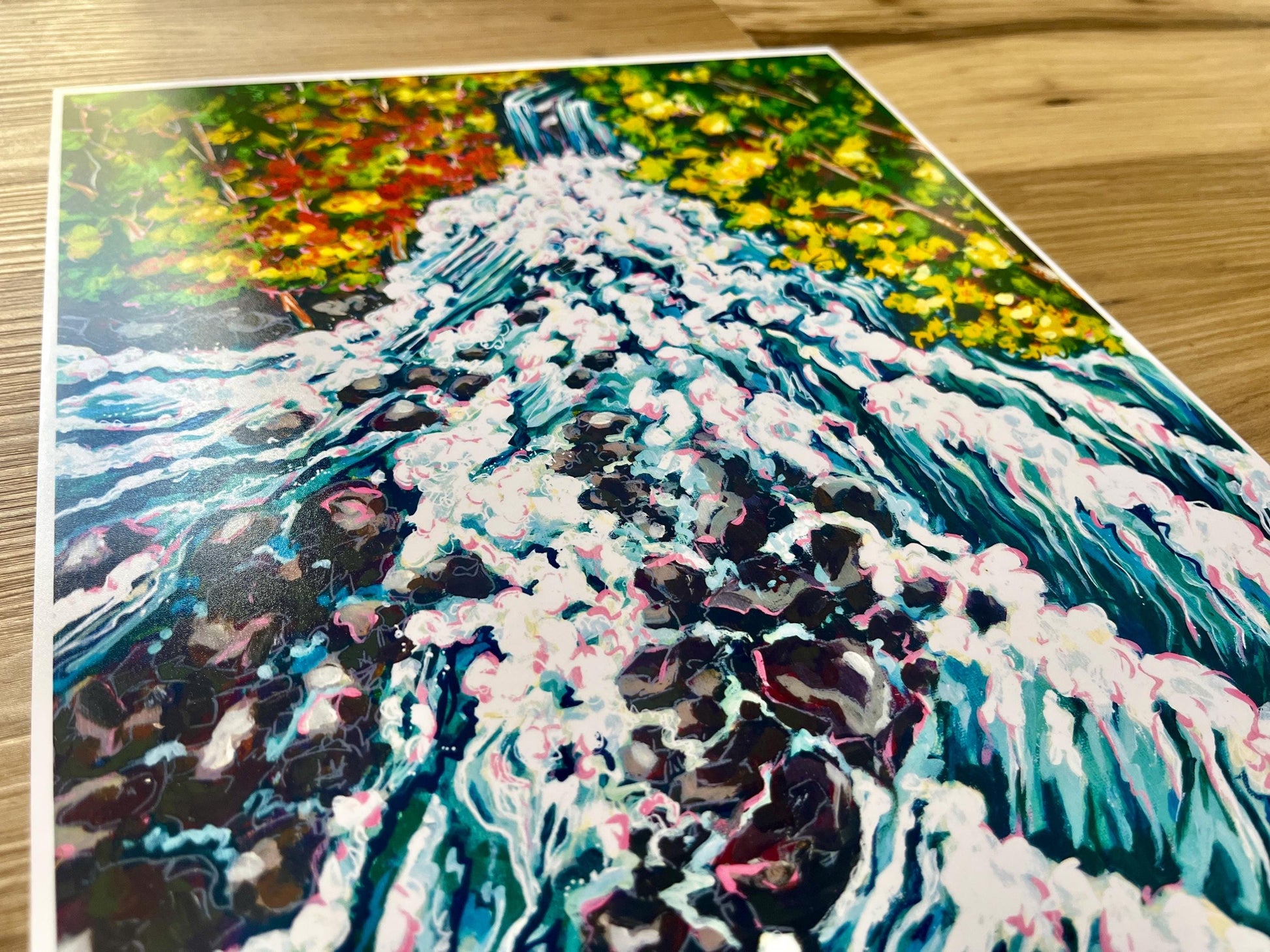 This is a fine art print of my original painting Roaring Waters. it is a fall scene of a cascading Appalachian falls, roaring and always moving. the power of water is present in this piece.