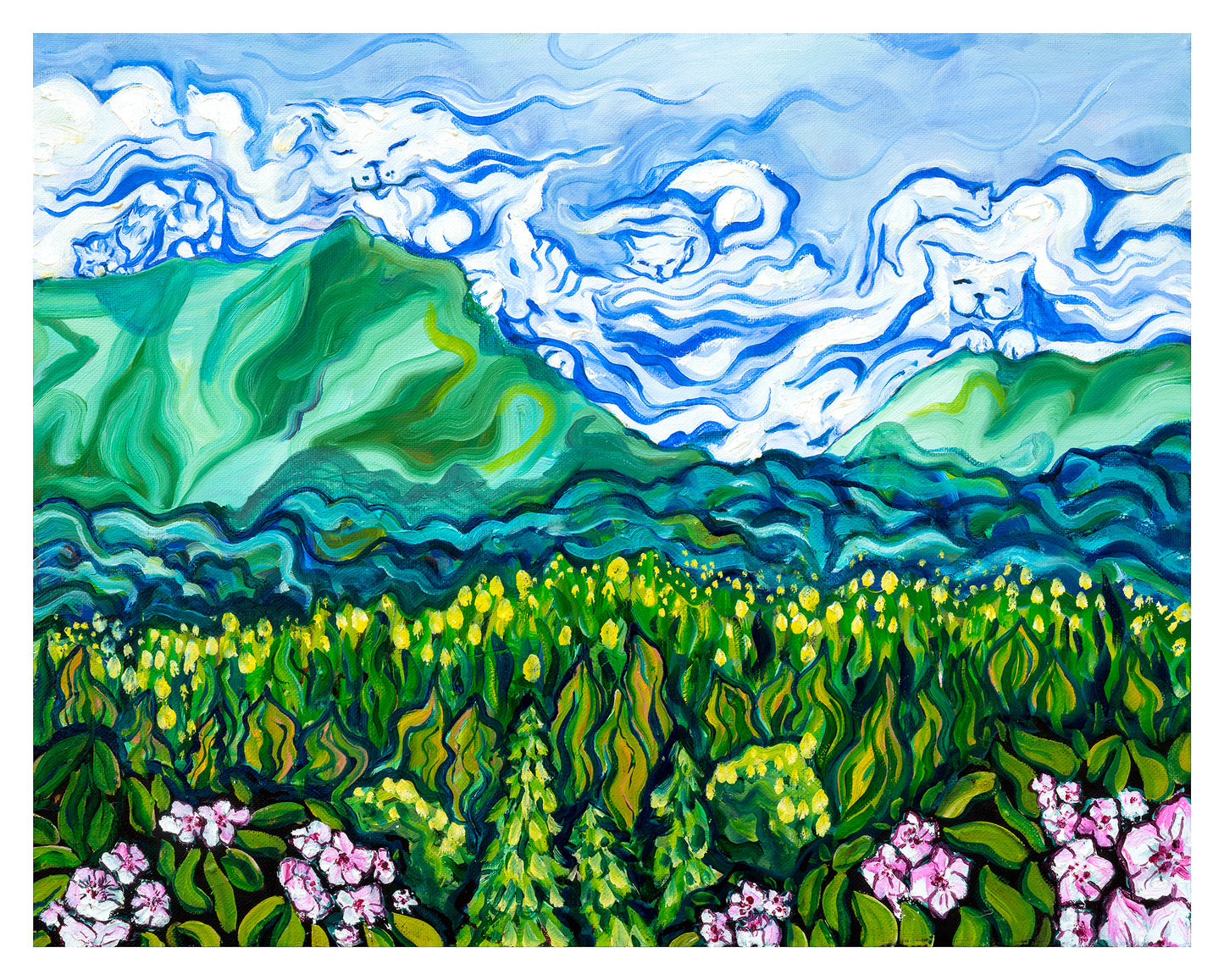 A surreal summer time view. It comes unframed, but the painting continues around the edges.