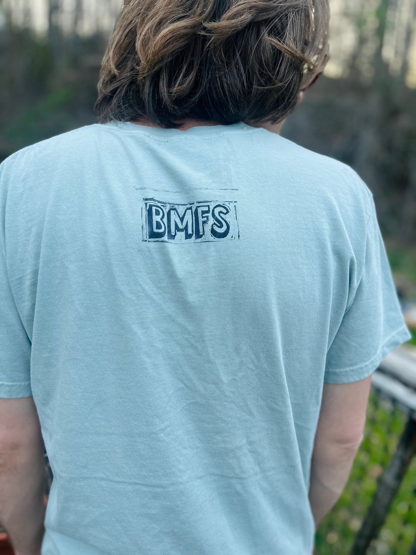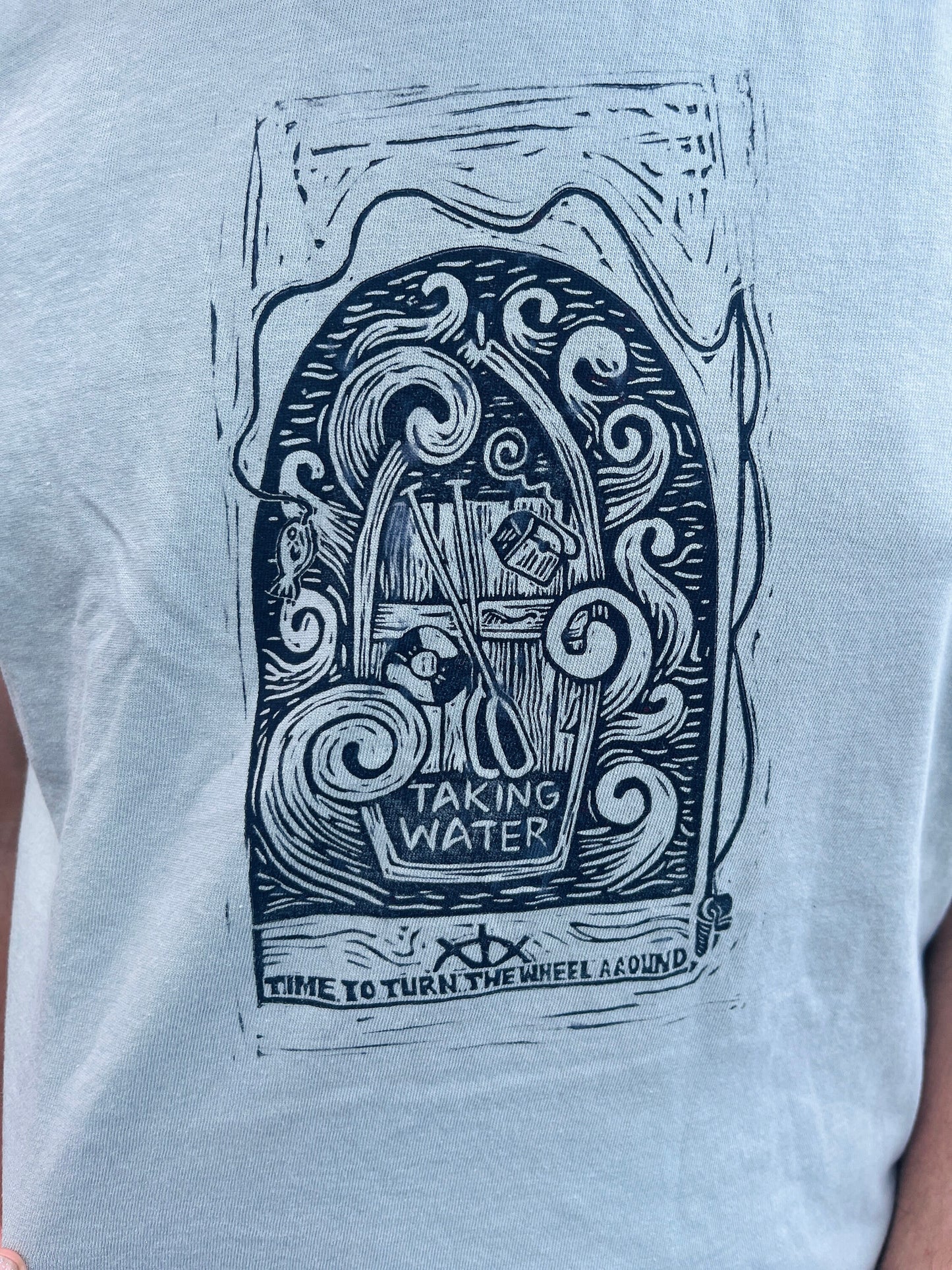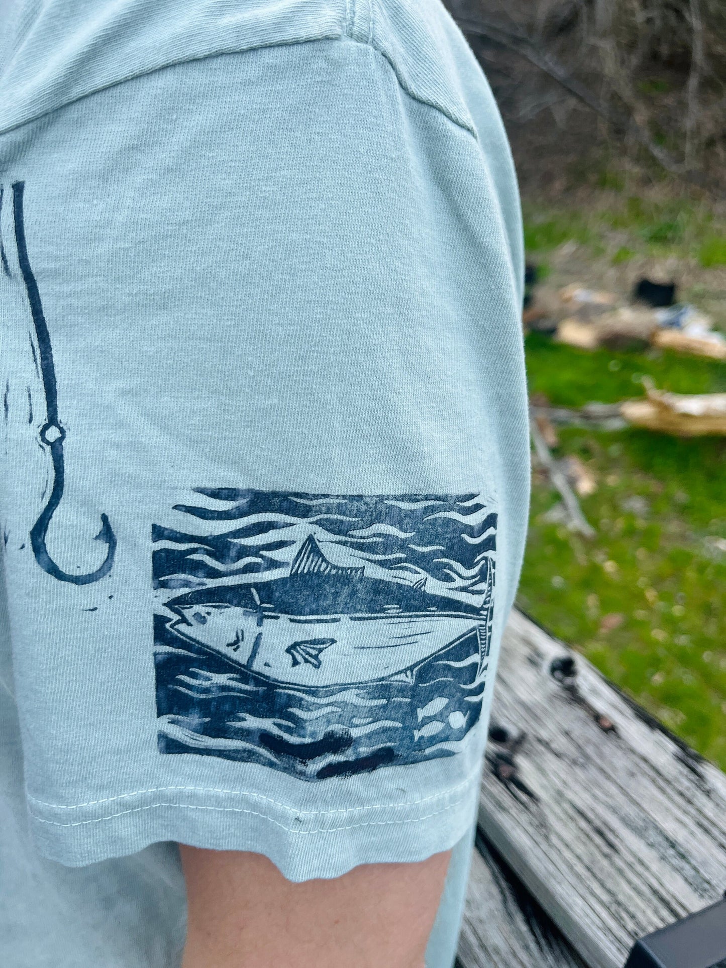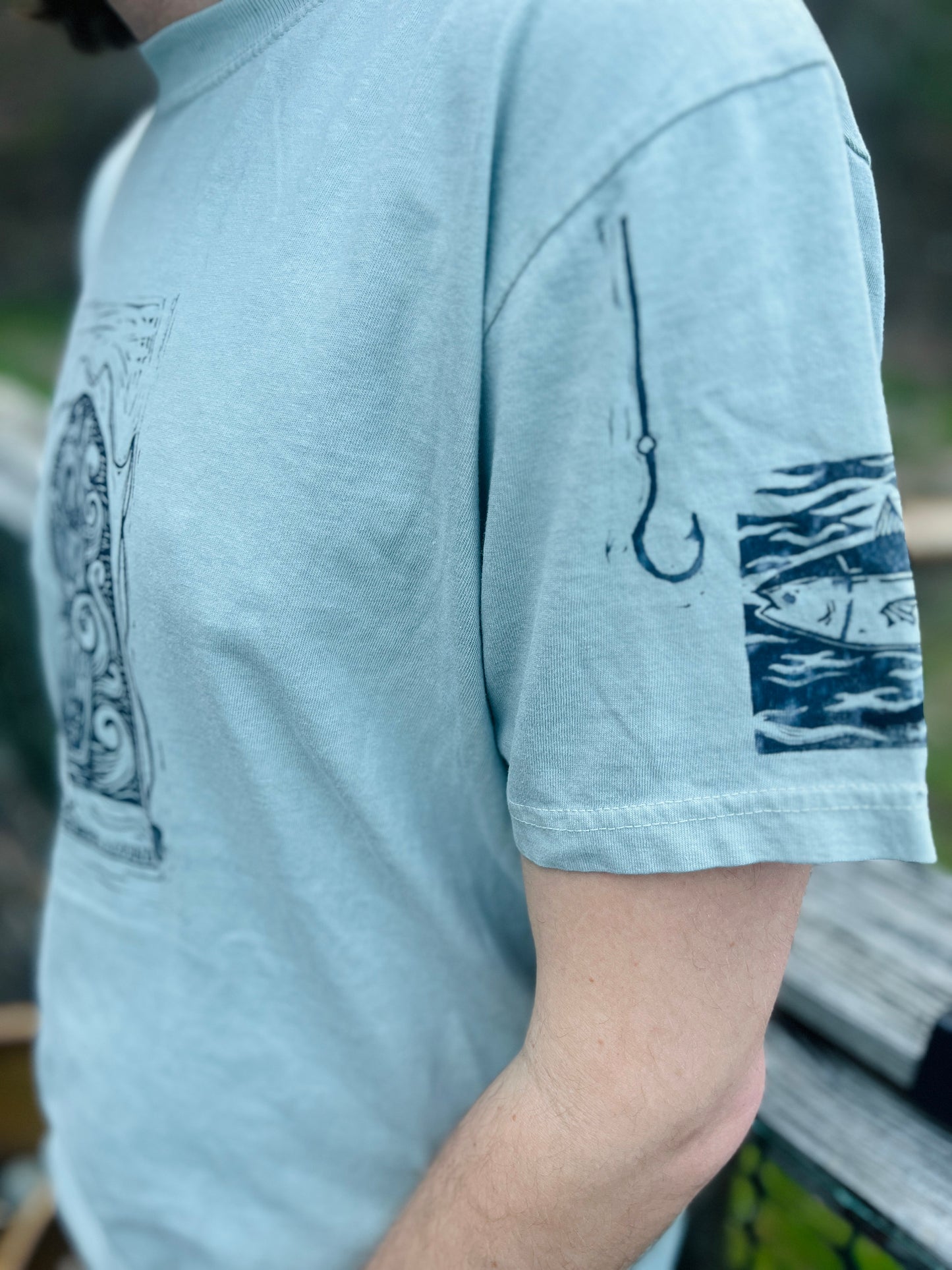 Inspired by my one of favorite Billy Strings song - Taking Water - I created this linocut T design. On the front of the shirt, there is a large print of a boat filled with fishing gear taking water, and at the bottom I put the chorus lyrics "Time to turn the wheel around" as a note of positivity, that you are in control. This shirt also has a fish printed on the sleeve and BMFS on the back to tie it all together. 3 original prints on one shirt! Super special and handmade. All of my original designs and printing.