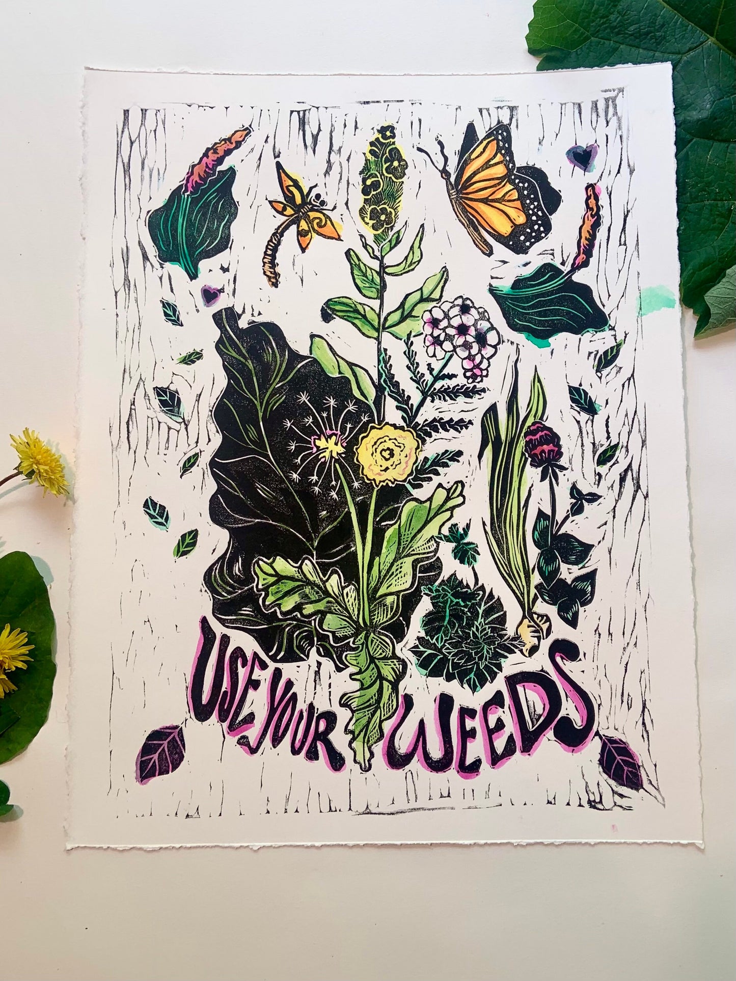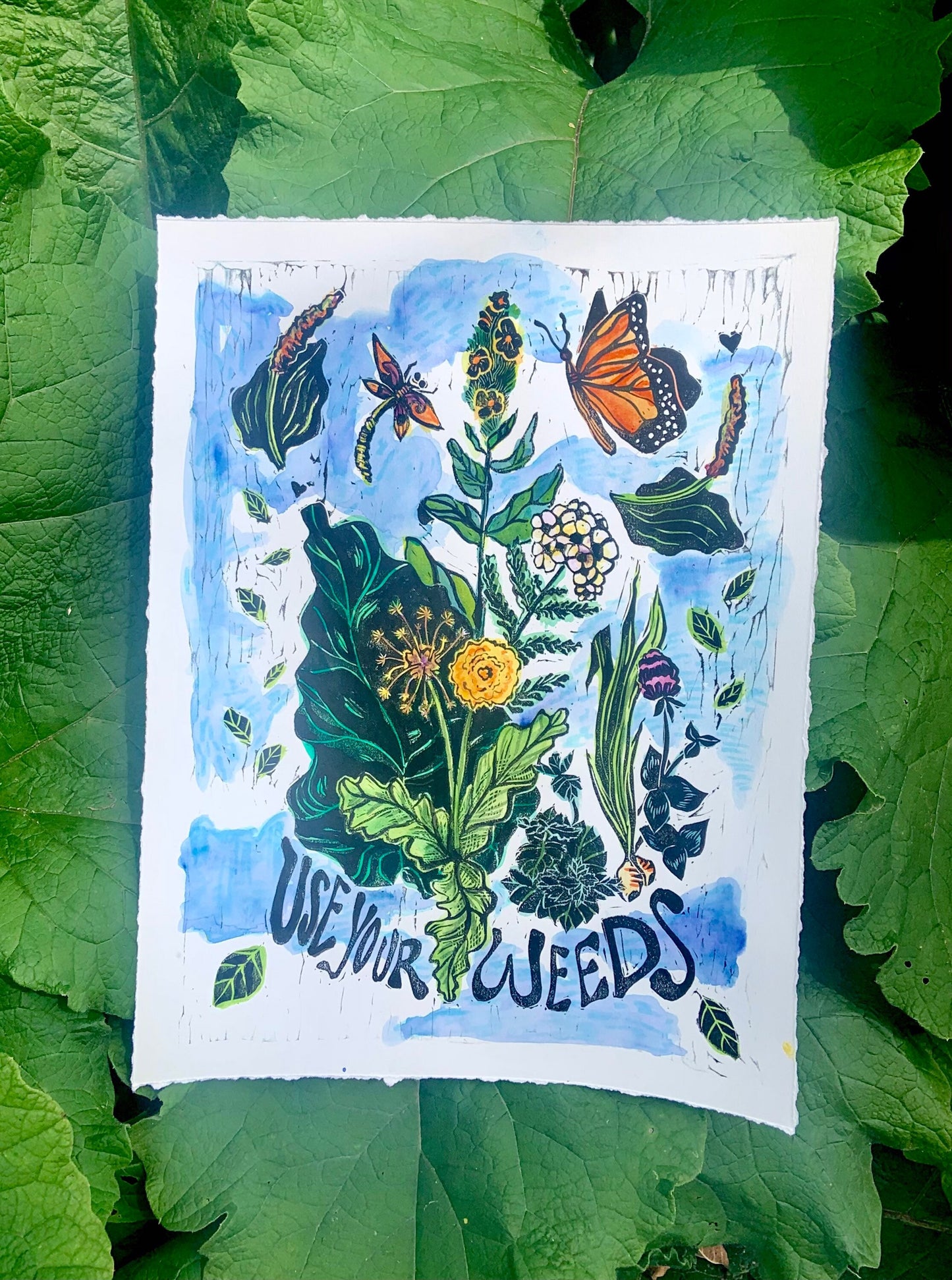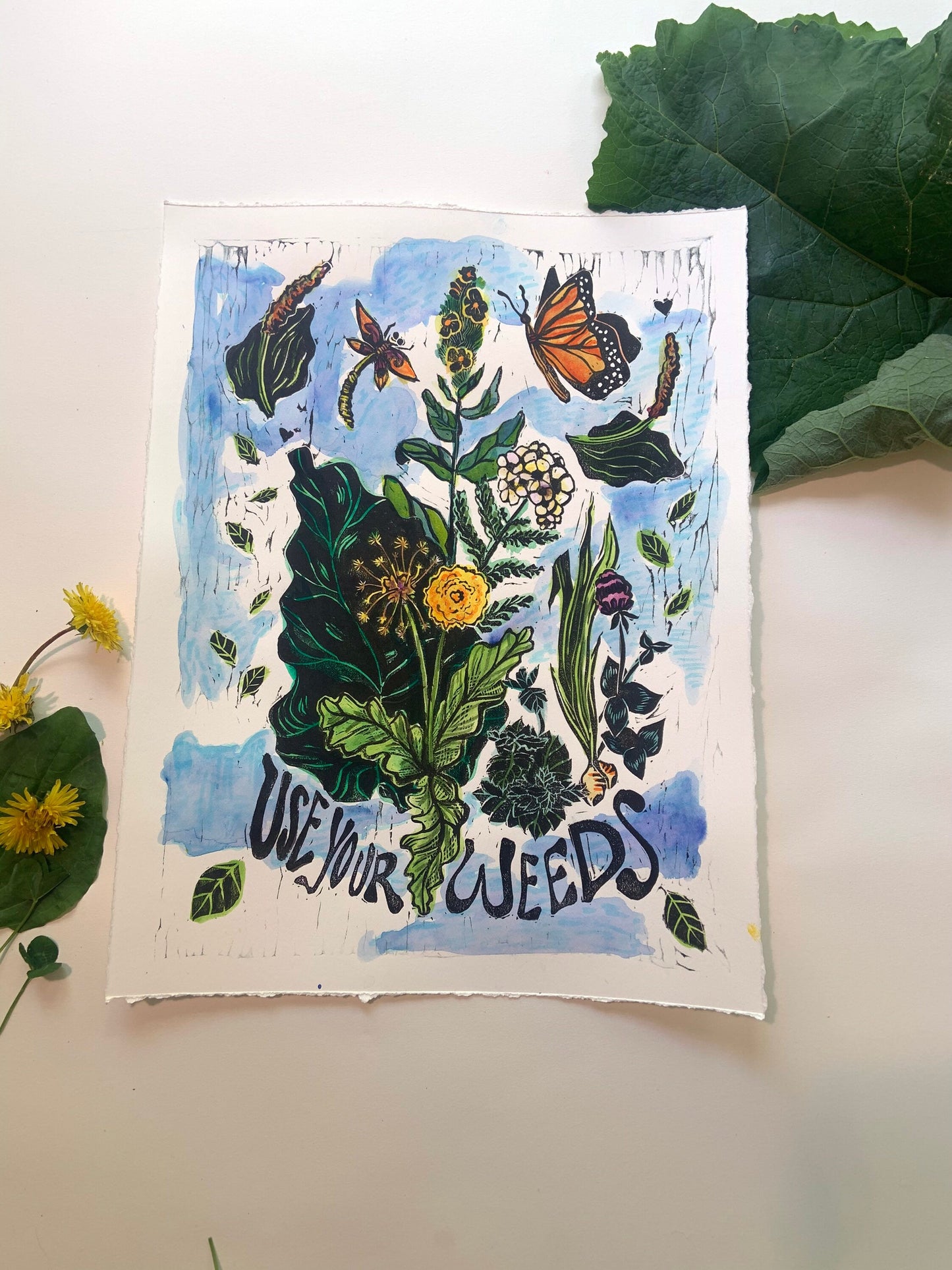 Use Your weeds, herbalist print, Lino cut