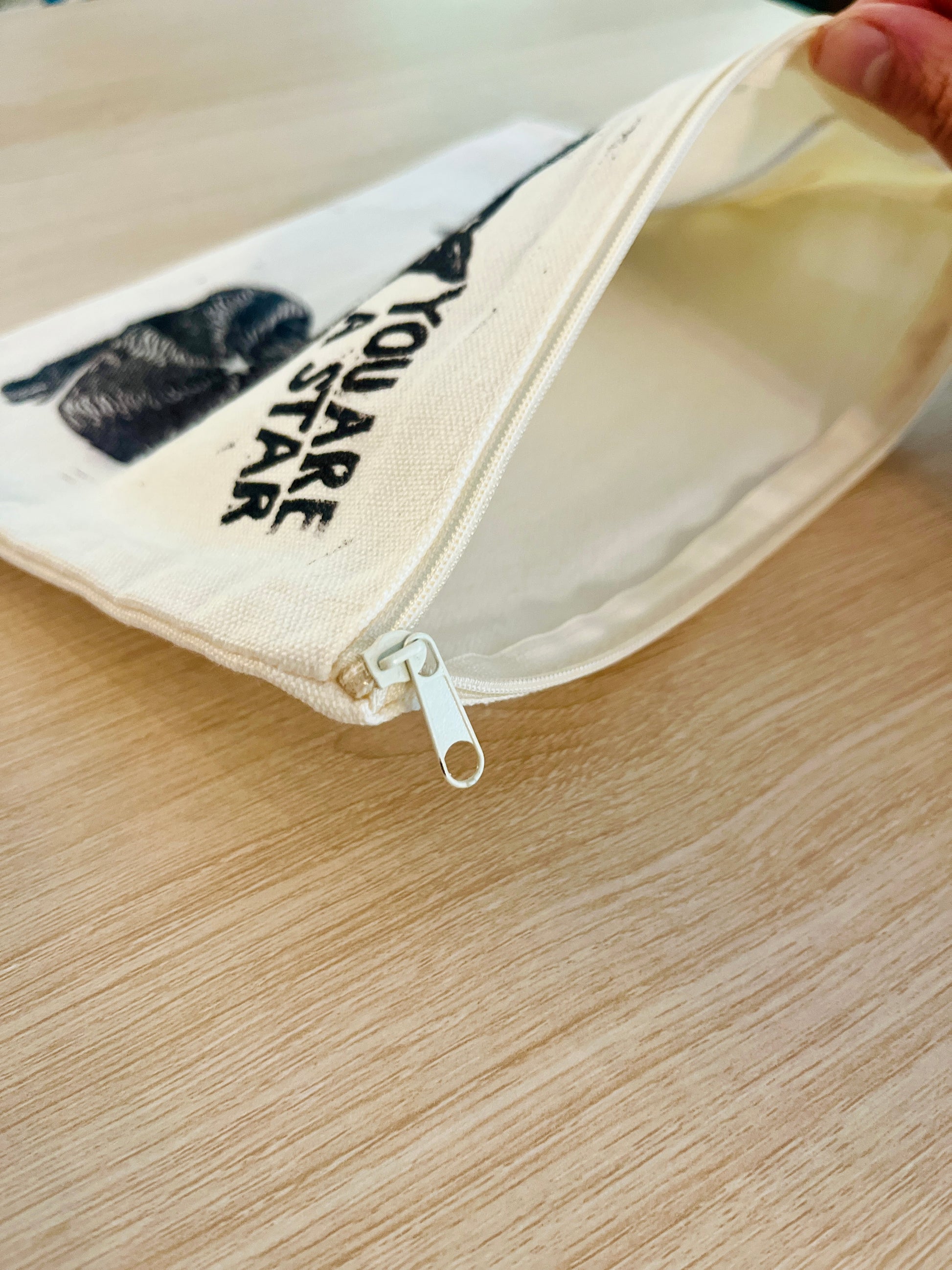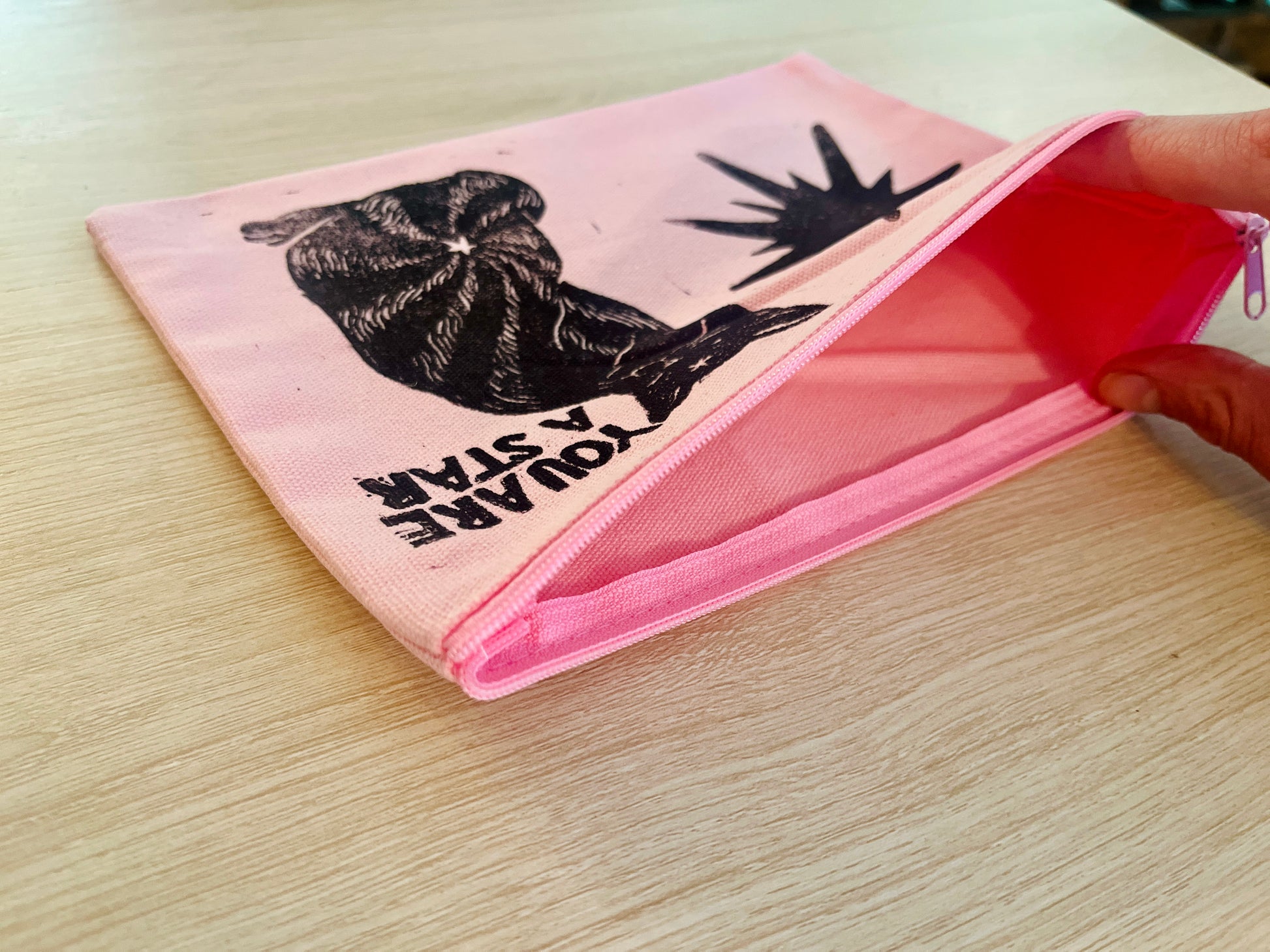 This zip pouch comes in handy and is perfect for storing your cat treats, pens, pencils, keys, nail polishes, tooth brush, make up, or whatever else you can think of! This is an original linocut design and carving, hand stamped lovingly onto these light canvas pouches. You can choose from a light pink or a natural toned pouch color.